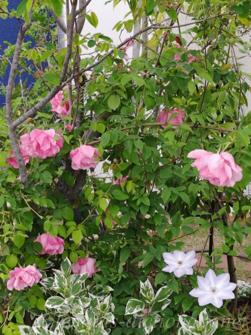 ピンクのミニバラとクレマチスのコラボです。