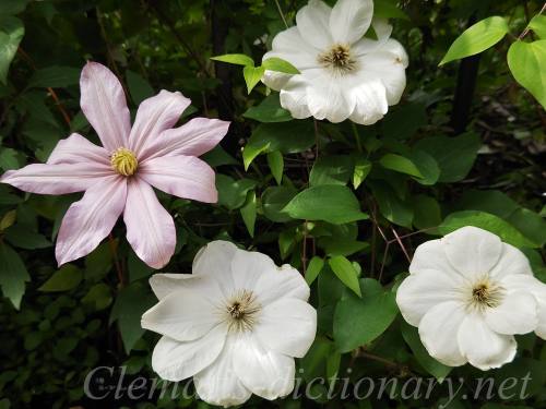 左の白花はカザグルマ(霞川)、その右がミセスNトンプソン、その右のピンク花が早咲き大輪系のサラエリザベスです。