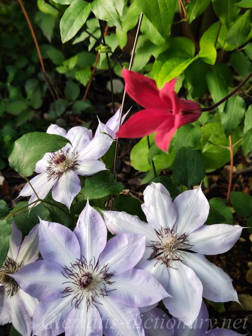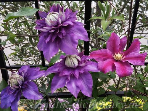 左上の赤紫系クレマチスと右下の青紫系クレマチスを真ん中の白花で調和しています。