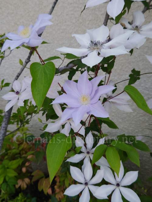 上にはフロリダ系ビエネッタ、右の白花は早咲き大輪系の銀河、その右の紫花はインテグリフォリア系のアラベラです。