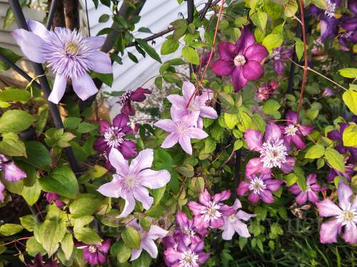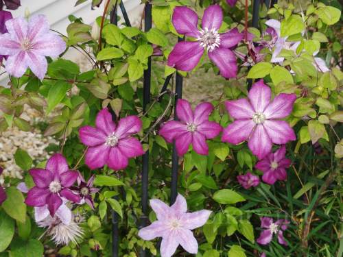 遅咲き大輪系テクサとフロリダ系カシス(紫)、早咲き大輪系ブルーライト(左上水色)