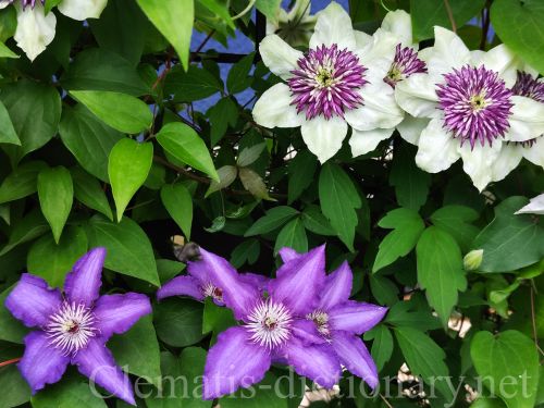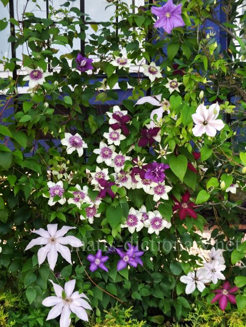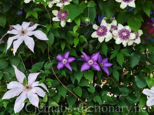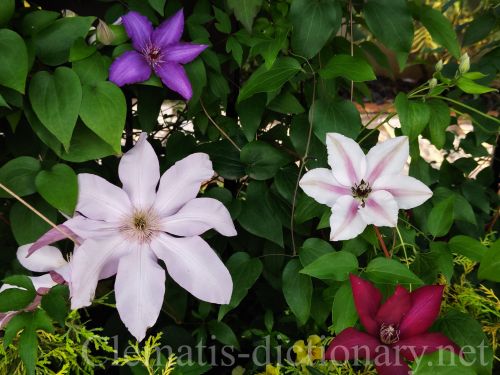 早咲き大輪系ローズシュプリーム、テッセン、遅咲き大輪系ミクラ、早咲き大輪系ソリダルノシチ、遅咲き大輪系ペルル・ダジュール、中央の濃い紫はビチセラ系ダークアイズ