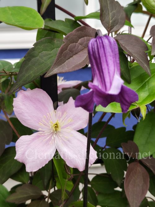 テンテルとよく似ていますが、うつむき加減に咲いている白ピンクのクレマチスはビチセラ系アイアムレディQです