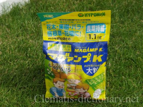 窒素:リン酸:カリウム 8:12:10 とリン酸成分が多めで花をたくさん咲かせたい場合にいい。四季咲き性クレマチスの花後の追肥に最適。微量元素も入っている。